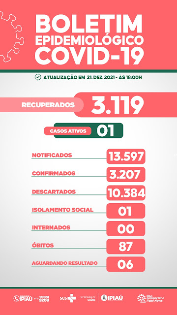 Boletim Covid/ 21 de dezembro, da Secretaria de Saúde de Ipiaú informa que no momento, temos 01 caso ativo.